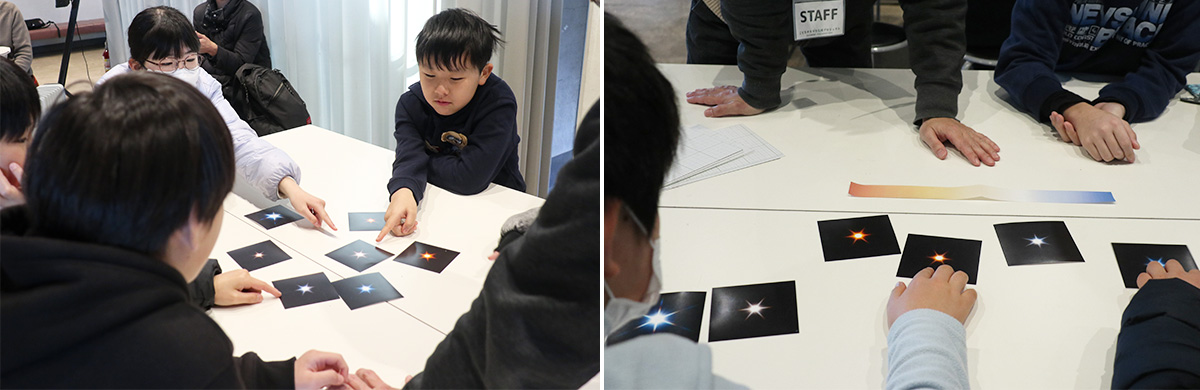 最初に、冬の一等星を「明るさ」や「色」に注目して順に並び替えるグループワークに挑戦。星の色や明るさを並べてみることで、星までの距離や温度、寿命などが星ごとに異なることが見えてきました。