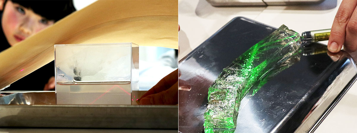さらに、レーザーの光がどのように進むのかを水や寒天を使った実験を通じて観察しました。ぐにゃりと曲げた寒天の中を光が通り抜ける様子に、子どもたちからは「直線じゃなくても光が届くなんてすごい」と驚きの声が上がりました。