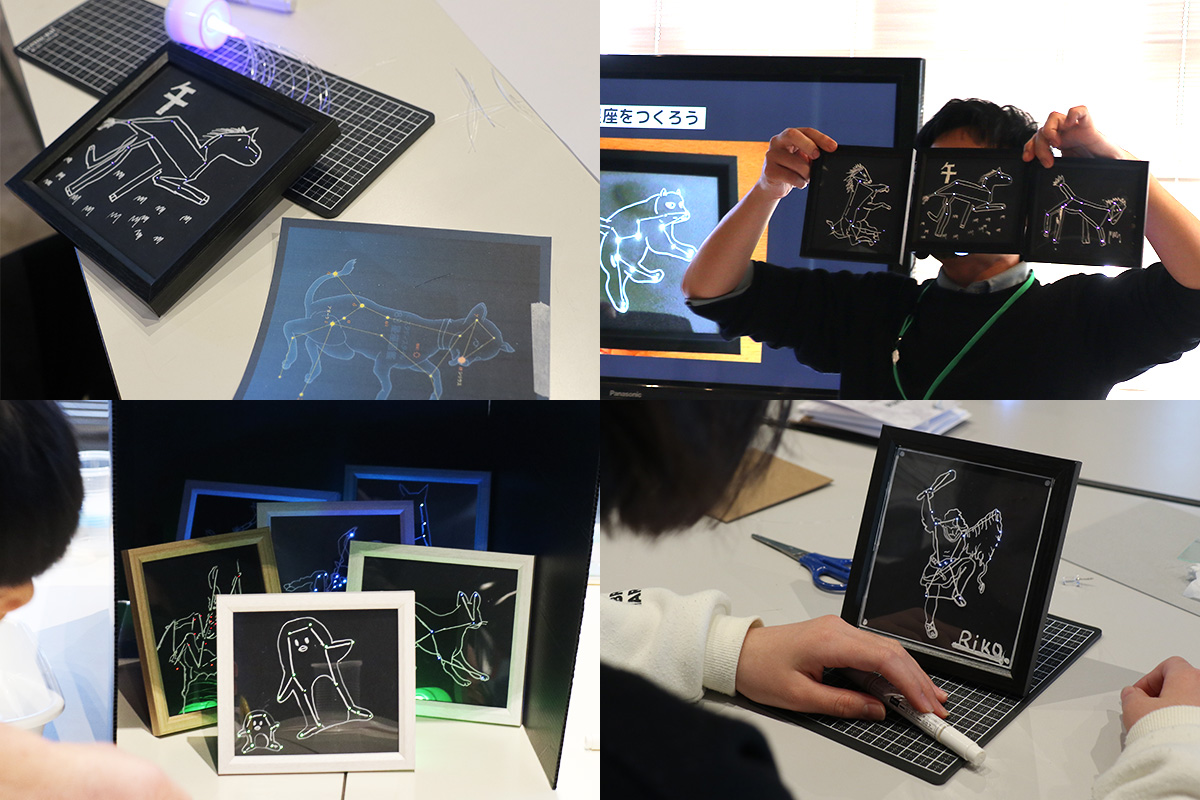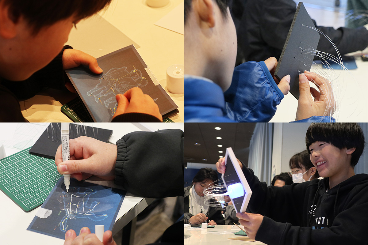 その後、好きな星座の台紙を選び、星の位置に光ファイバーを固定。LEDの光を通し、そこから思い浮かんだ形や線を自由に描きながら、自分だけの「光る星座」を完成させていきました。